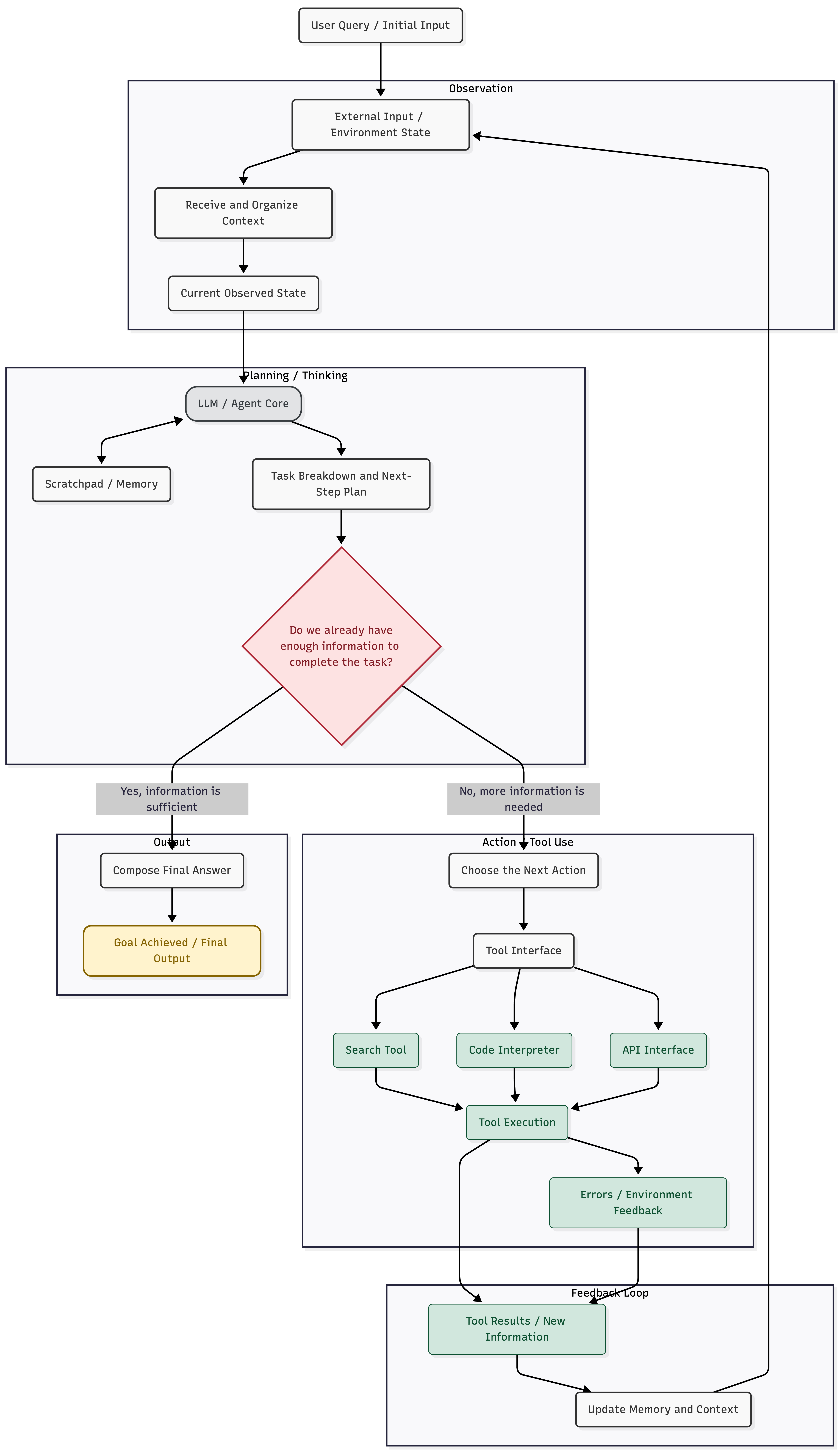 Although this diagram looks a bit complicated, it can actually be simplified into: Planning -> Action -> Observation. In other words, the large model produces a plan, then the Agent executes it. After execution, the model observes the resulting output to determine whether the goal has been achieved. If not, the model produces the next plan, and the Agent executes again, repeating the cycle until the model decides that the goal has been completed.